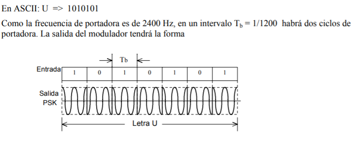 La letra U está codificada en ASCII, siendo su velocidad de 1200 bps. Esta letra se aplica a un modulador FSK donde f0 = 1200 Hz y f1 = 2400 Hz; vamos a dibujar la forma de onda a la 0 0 0 0 1 0 1 1 0 0 1 0 0 1 Tb Entrada Salida ASK PI3 salida del modulador. Verifique también las condiciones de ortogonalidad de este modulador